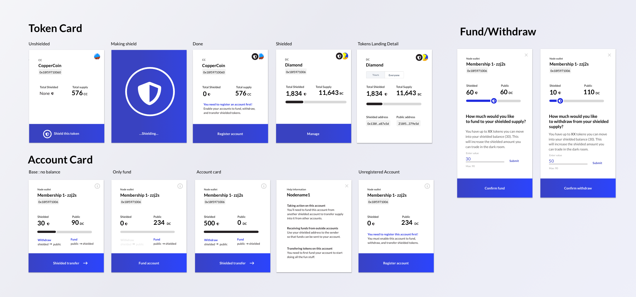 Outcome: A design that leveraged card design best practices to display tokens as “trading cards’ that quickly displayed Zether balances available for trading, funding, or withdrawal. Delightful interaction to account for shielding of accounts and tokens.